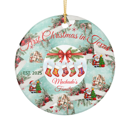 First Christmas in Texas Ceramic Ornament — Personalized Family Name & EST. 2025 Holiday Decoration